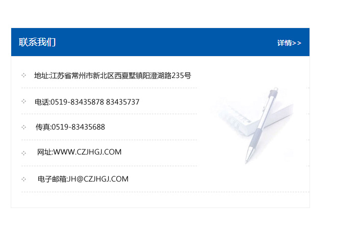 地址:常州市新北區友邦商務大廈1幢16、17層  電話:0519-85101652  傳真:0519-85112595  郵編:213022  網址:www_cz-jiayue_cn.mdsyzs.com  郵箱:xiajifengaa@163.com